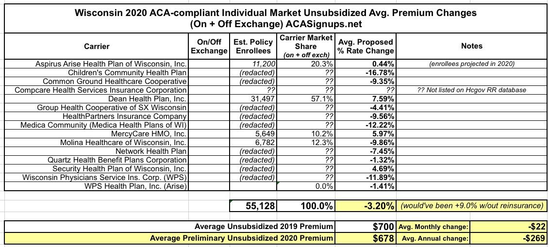 Unfortunately, the actual enrollment data for most of the carriers in Wisconsin is redacted, meaning I have no way of getting a total Individual Market size or the weighted average, although Gov. Evers already notes that it's a 3.2% reduction in his press release: