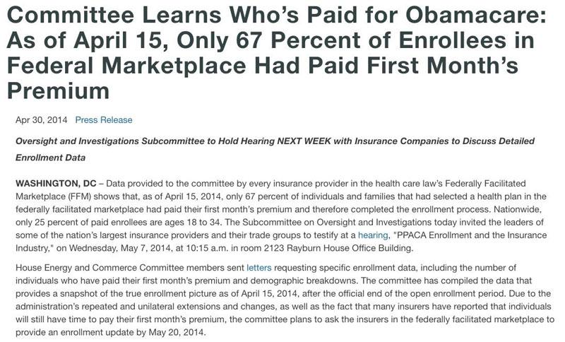 It got so out of hand that the then GOP-controlled House Energy & Commerce Committee (which was chaired at the time by Republican Representative Fred Upton from here in Michigan) actually sent out a (deeply flawed) survey to a bunch of insurance carriers demanding to know how many ACA exchange enrollees had actually paid their first premium. They then posted the results of their "survey" and attempted to make a huge stink about how, supposedly, only 67% of enrollees had done so.