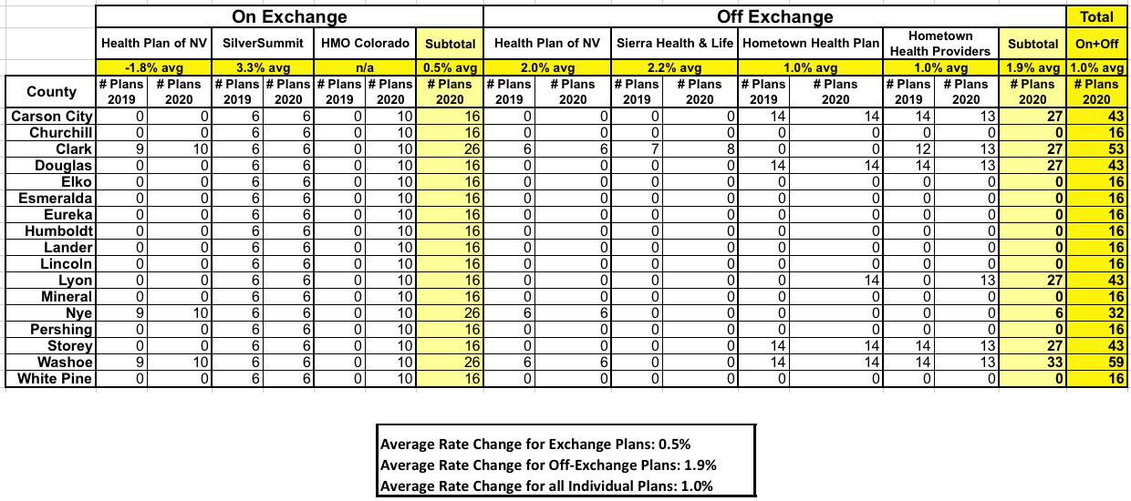 Based on the rate submissions the Division has received for 2020 plans, there are three insurance companies that submitted proposed rates for plans on the Silver State Health Insurance Exchange (Exchange): Health Plan of Nevada, SilverSummit, and HMO Colorado, with up to 26 individual health plans to choose from. The proposed average increase is 0.5% for those health insurance plans sold On-Exchange through Nevada Health Link.