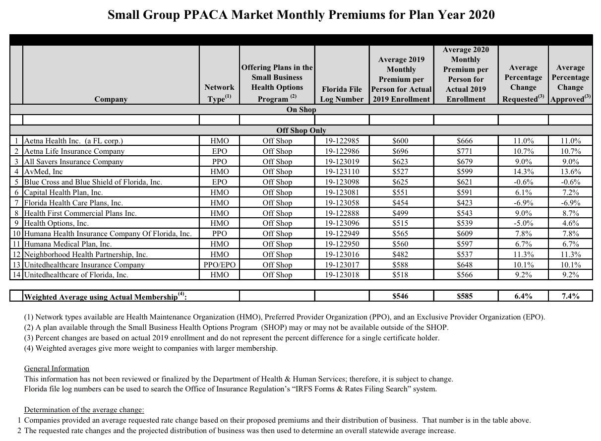 A few weeks ago I posted the preliminary 2020 ACA-compliant premium changes for Florida's Individual and Small Group markets. At the time, the requested rate hikes were only available for about 4 of the 10 carriers participating in the Individual Market, and just 10 of the 14 carriers on FL's Small Group market. However, the Florida Office of Insurance Regulation did provide the weighted average request: A 1.2% increase for the Indy Market and 6.4% for Small Group plans.