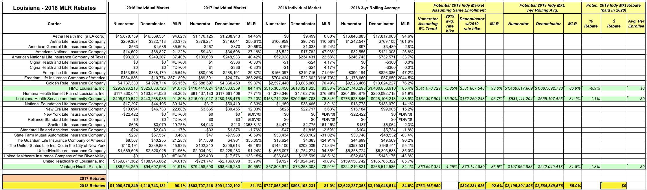 MLR rebate payments for 2018 are being sent out to enrollees even as I type this. The data for 2018 MLR rebates won't be officially posted for another month or so, but I've managed to acquire it early, and after a lot of number-crunching the data, I've recompiled it into an easy-to-read format.