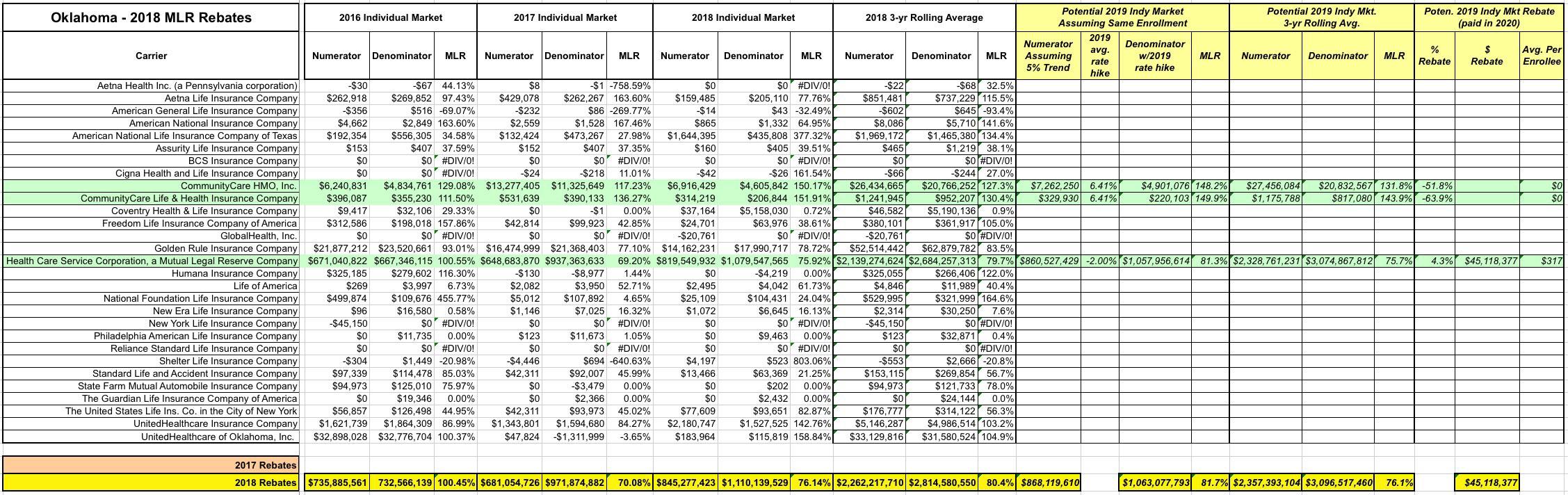 NEXT year, however, there could potentially be a massive Indy Market rebate...again, courtesy of Blue Cross Blue Shield of OK. They ran a horrible 100.6% MLR in 2016, but that's dropping off the formula next year, so they'll be looking at 2017's disturbingly low 69.2% and 2018's still-low 75.9%. With only a 2% average rate drop for 2019, their 3-year rolling average could come in at under 76%, which would result in up to a whopping $45 million in rebates being paid out to enrollees.