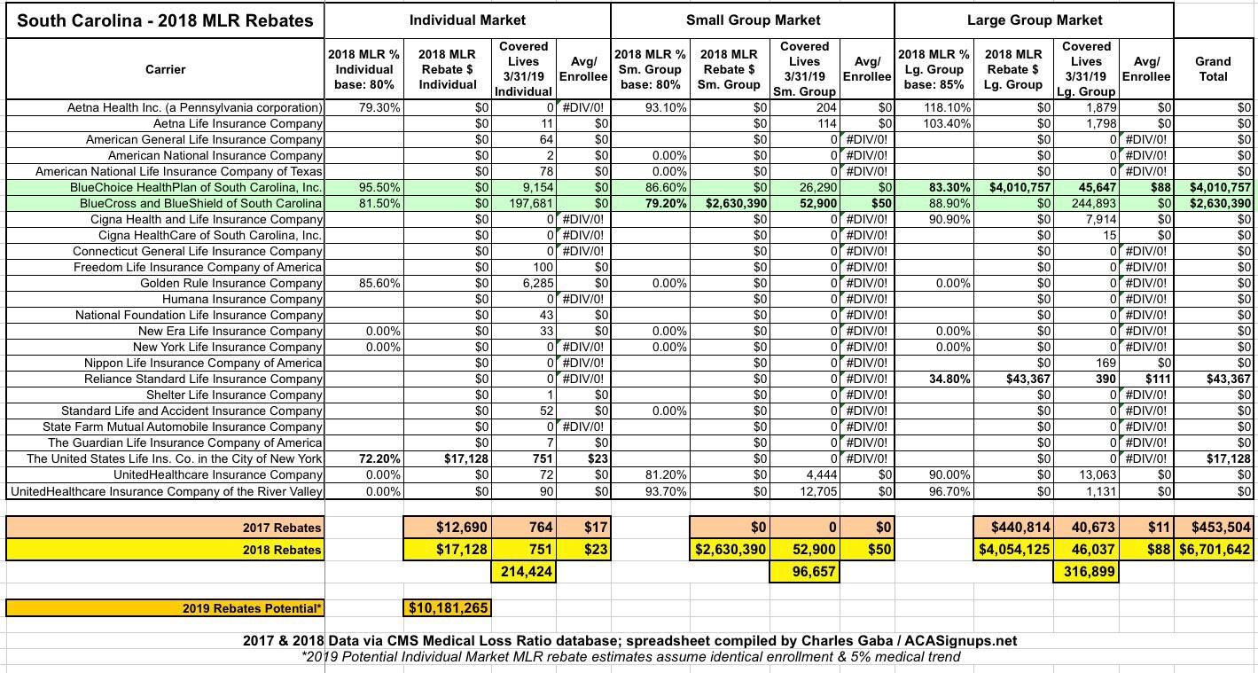 South Carolina: Keep your eye on BCBS next year re. MLR rebates