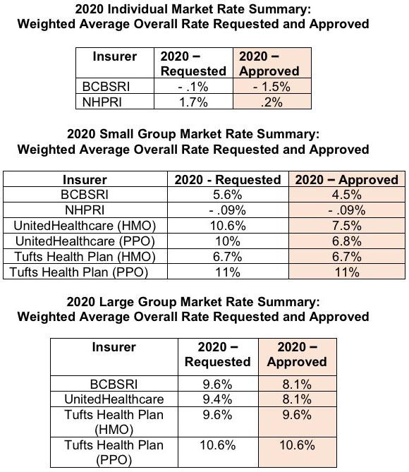 ...In Rhode Island, for 2020, the large group market had the biggest overall rate increases with the lowest change being 8.1% (United Healthcare and Blue Cross Blue Shield) and the highest increase being 10.6% (Tufts Health Plan). The small group market rate changes varied, with the lowest being a decrease of .09% (Neighborhood Health Plan) and the largest being an increase of 11% (Tufts Health Plan). Many factors contribute to the continued growth in insurance premiums, including policy decisions at the federal level, but the main driver continues to be the rising costs of medical care.