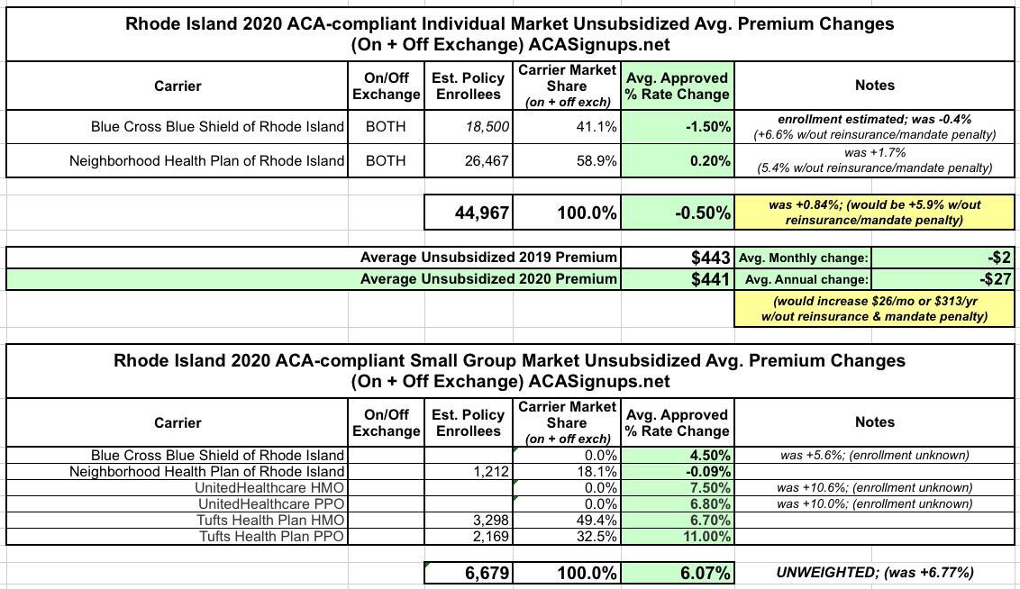 Rhode Island: *Approved* unsubsidized 2020 ACA premiums: 0.5% *lower* thanks to reinsurance/mandate penalty