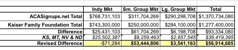 I actually get a grand total of $1.37 billion...around $93 million higher than Kaiser. A big chunk of this is because Kaiser chose to leave out four states: Kansas, Montana, Nevada and North Dakota, because these four states are apparently missing at least 10% of their enrollment data...whereas I've included all four of them:
