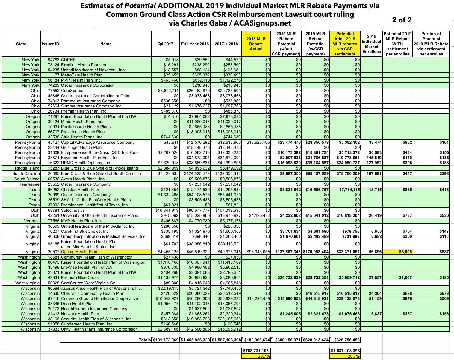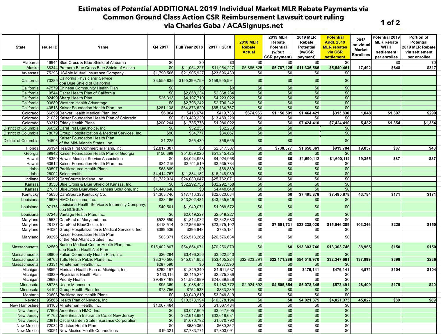 As you can see in the table below, I've gone back through my big MLR Rebate Project to try and estimate just how much more each carrier in the Common Ground lawsuit (that's the lead named plaintiff in the class action case) might have to rebate next year beyond what I already estimated their 2019 MLR rebate totals would be without these additional settlement funds.