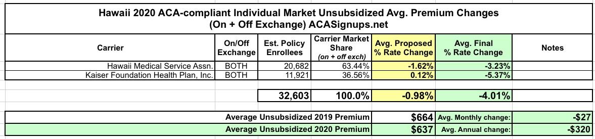 Hawaii: *Final* avg. 2020 #ACA premium changes: 4.0% rate drop