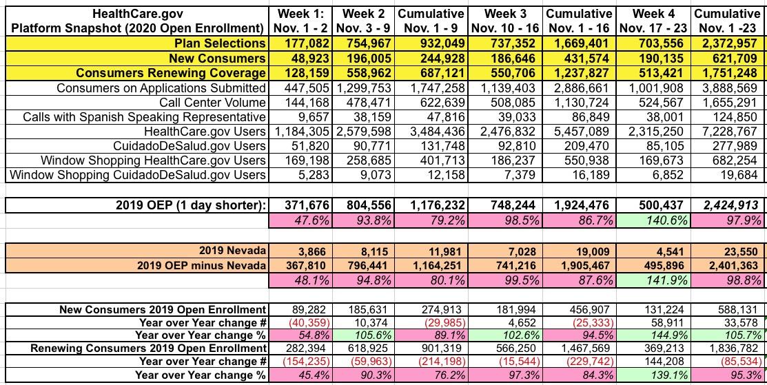 2020 Week Four Snapshot Report: 704K QHPs on HC.gov; remember the Thanksgiving factor
