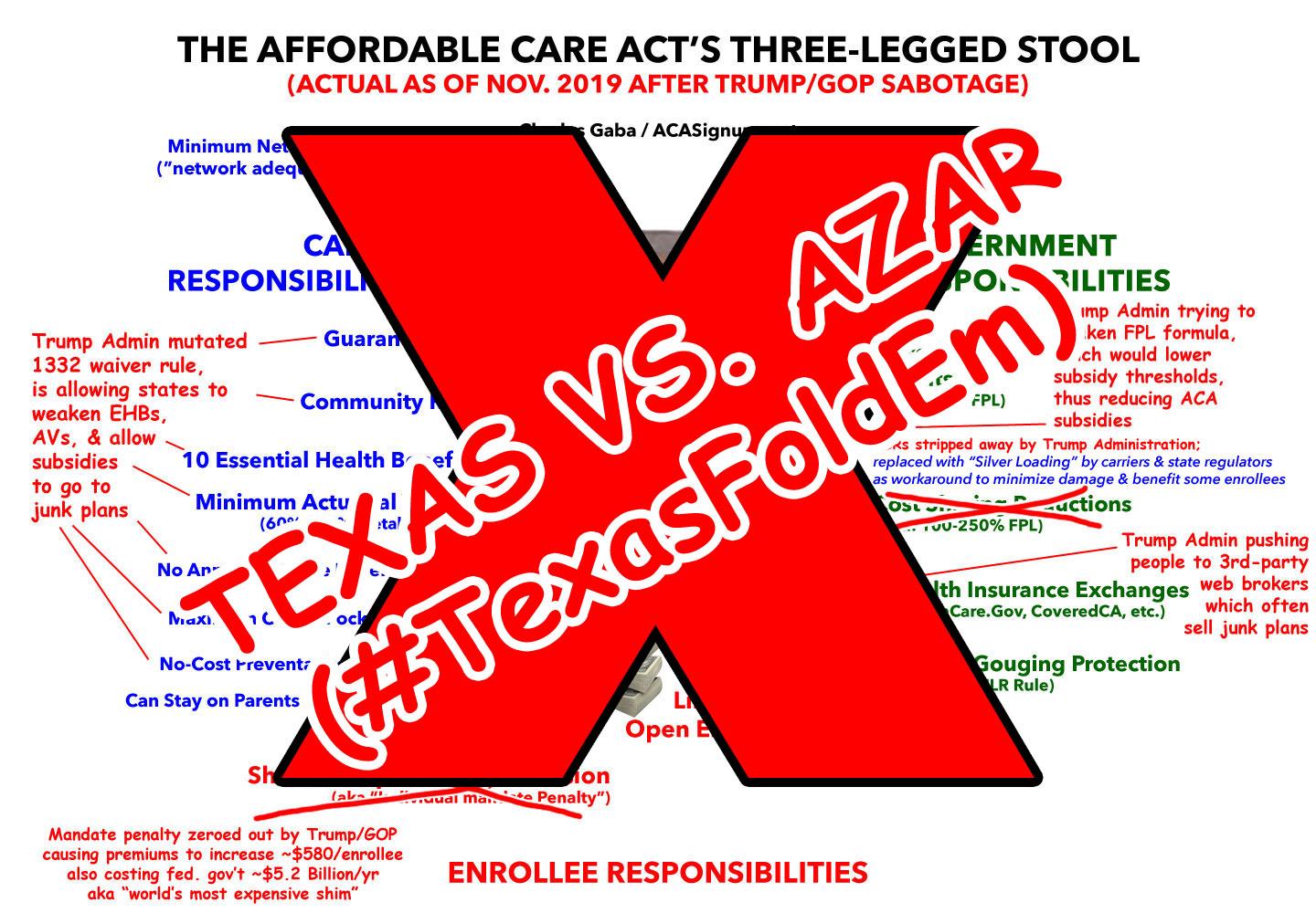 So what happens if the Texas vs. Azar lawsuit is ultimately successful? Well, it's possible that the only thing which will happen is the underlying individual mandate penalty is struck from the law, in which case the rest of the ACA would continue to chug along as is. It's also conceivable that only the blue leg would be ripped away (i.e., the protections for coverage of pre-existing conditions), leaving the rest of the stool intact.