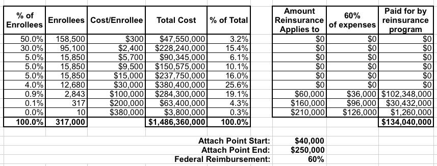 I've written a (hopefully) straightforward tutorial on how reinsurance works. The beauty of it is that looking at some of the other states which have implemented similar programs, it's likely that the federal government would end up covering anywhere from 35% - 85% of the cost.