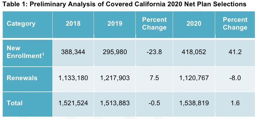Preliminary analysis shows that the total number of net plan selections for 2020 is 1,538,819, which reflects 1,120,767 consumers renewing their coverage and 418,052 consumers newly signing up for coverage during open enrollment. Overall, there are 24,936 more plan selections compared to 2019, an increase of almost 2 percent (see Table 1: Preliminary Analysis of Covered California 2020 Net Plan Selections).