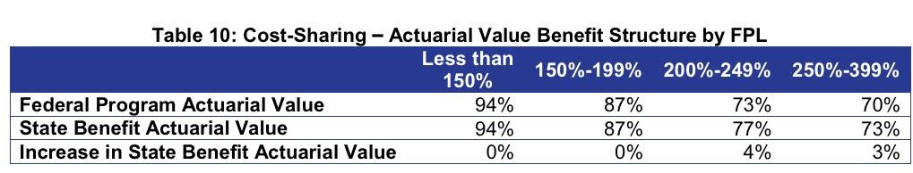 • The premium wrap would decrease the required contribution of income between 0.7 and 1.2 percentage points for enrollees below 400% of the federal poverty level (FPL). The cost-sharing wrap will reduce expenses through lower deductibles, copays, and/or coinsurance rates for on-Exchange Silver plan enrollees between 200% and 400% FPL. This would be achieved through a new CSR plan for enrollees between 200%-249% FPL with a 77% actuarial value (members currently eligible for 73% AV CSR plan) and expanding eligibility for the 73% AV CSR plan to members between 250%-400% FPL (members currently not eligible for CSRs).