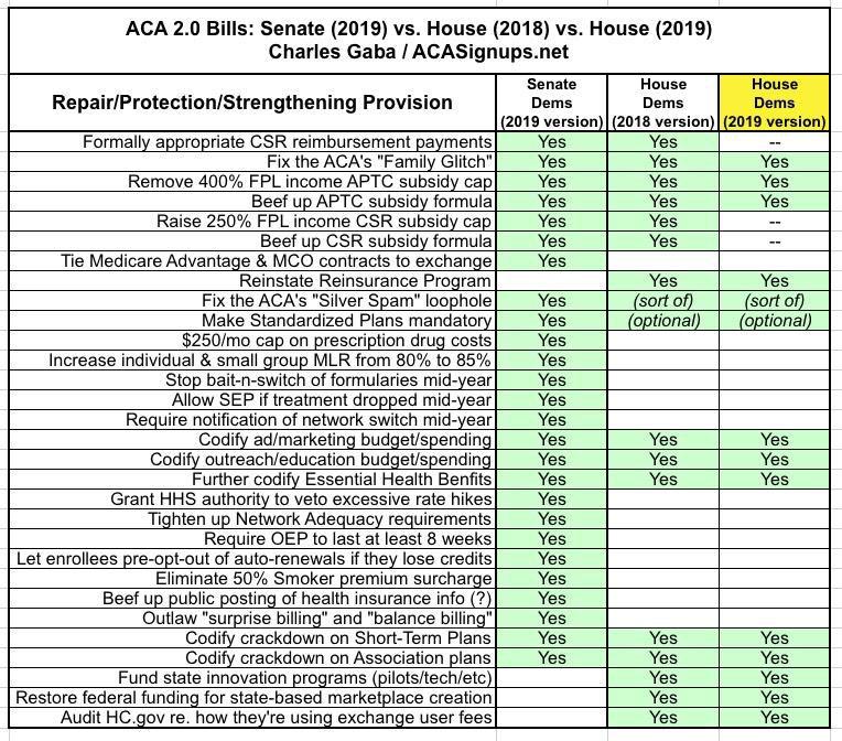 Here's a table which summarizes the Senate ACA 2.0 bill (CHIPA) vs. the House ACA 2.0 bills from 2018 and 2019: