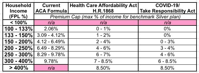 Currently, enrollees earning between 100 - 150% FPL pay between 2 - 4.1% of their income for benchmark premiums. Underwood's bill would reduce this to a range of 0 - 2% of their income, while today's COVID-19 response bill would reduce it to a flat 0% in premiums below 150% FPL.