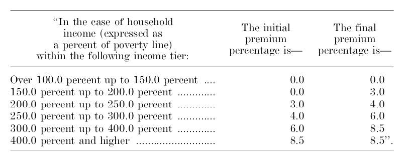 9 ‘‘(A) APPLICABLE PERCENTAGE.—The applicable percentage for any taxable year shall be the percentage such that the applicable percentage for any taxpayer whose household income is within an income tier specified in the following table shall increase, on a sliding scale in a linear manner, from the initial premium percentage to the final premium percentage specified in such table for such income tier: