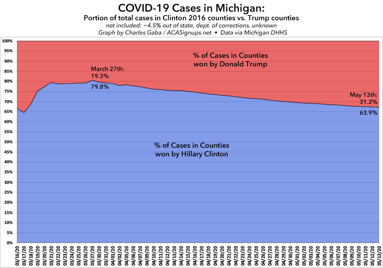 In short, as ugly as things were for the urban/Democratic-leaning areas of Michigan initially, over the past month or so they've been getting worse in the more rural/red areas at a faster rate.