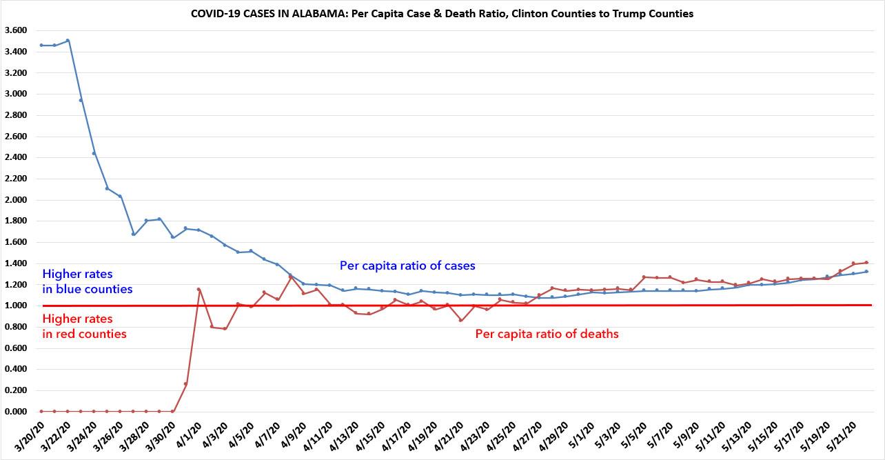 To clarify: On 3/20, Alabama COVID-19 cases were split exactly 50/50 between blue and red counties...but of course the population of those red counties is far higher; on a per capita basis, it was 0.049 per thousand in the blue counties vs. just 0.014 per thousand in the red ones. That's a ratio of 3.45:1. By 4/20, the per capita cases were 1.139/1,000 vs. 1.016/1,000, or just 1.121:1...in other words, cases had reached near parity on a per capita basis. Since then this trend has slowly reversed, however, reaching around 1.3:1 again as of yesterday.