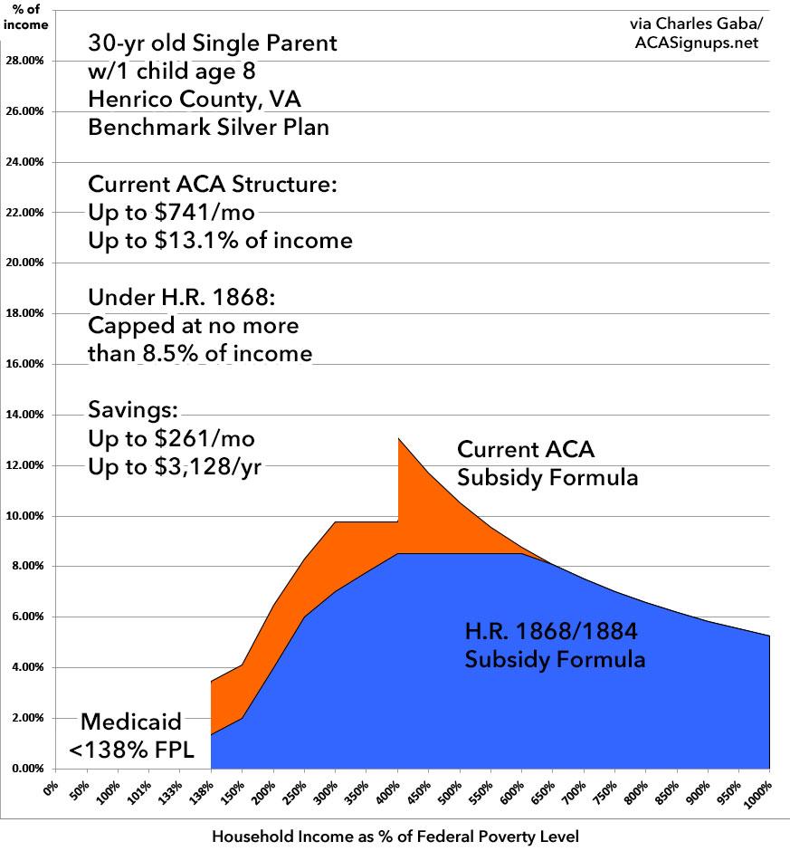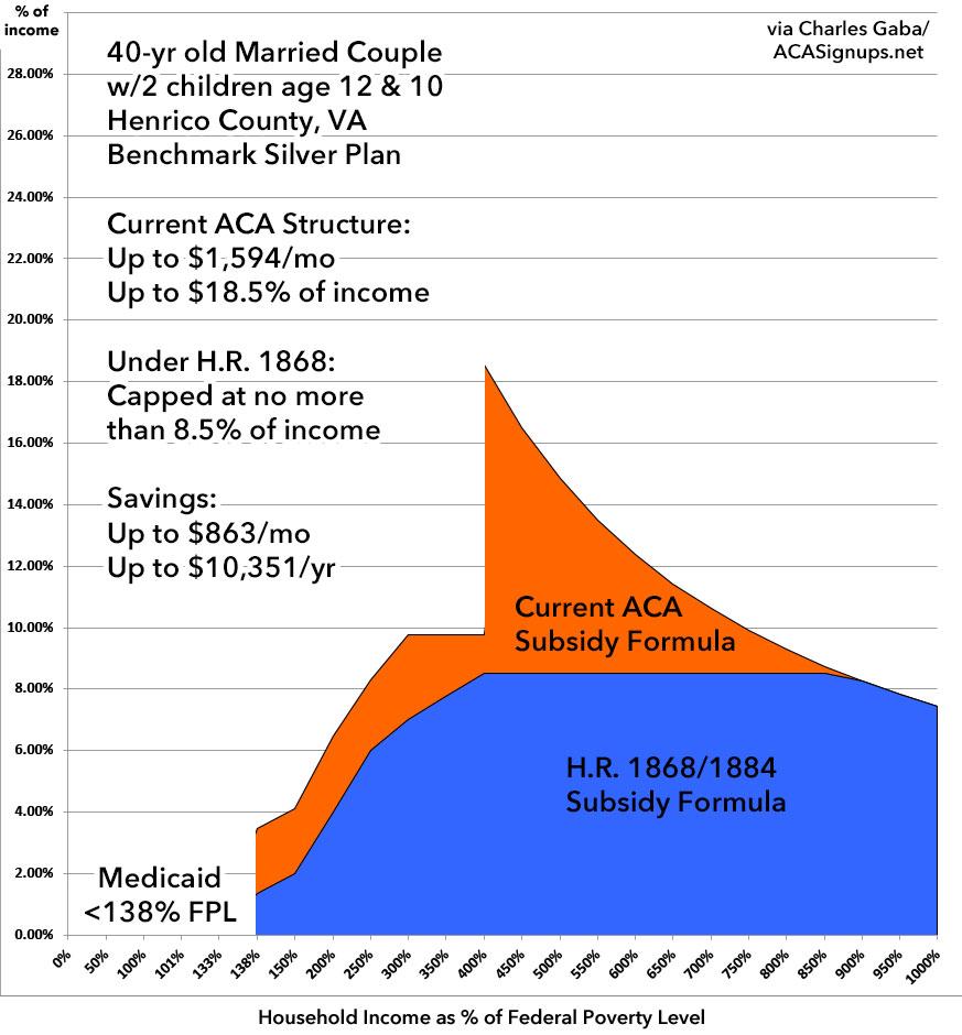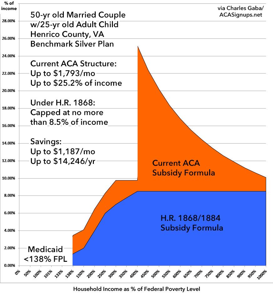 • Second, it makes the underlying formula for the tax credits more generous: Instead of the maximum amount the enrollee has to pay for a benchmark Silver plan ranging from around 2.1% of their income up to around 9.8%, H.R.1868 would drop this down to between 0% - 8.5% of income at the outside.