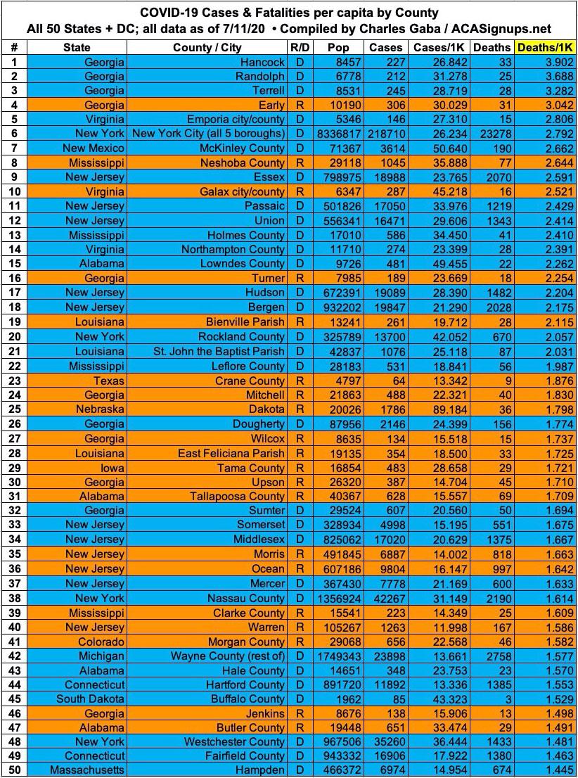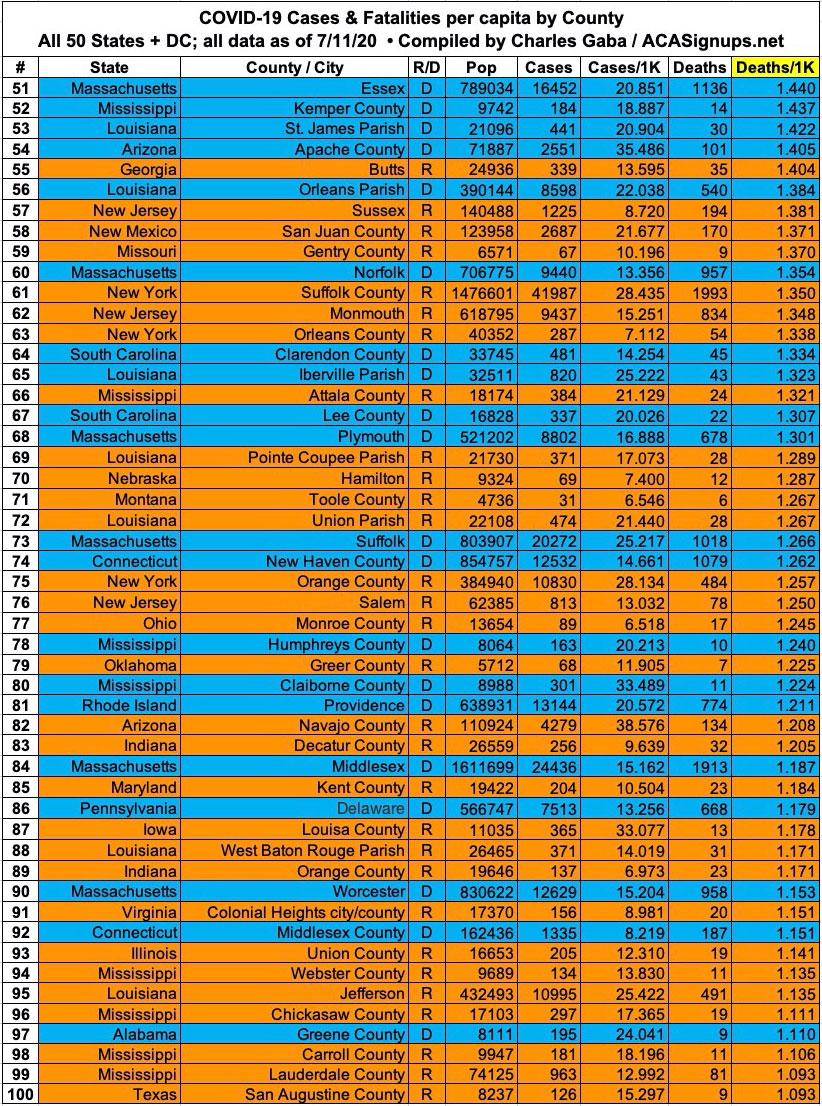 Here's the top 100 counties ranked by per capita COVID-19 fatalities as of Saturday, July 11th (click image for high-res version):