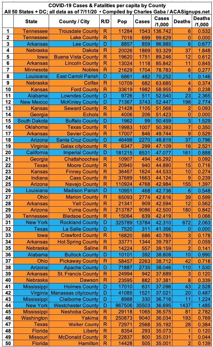 Here's the top 100 counties ranked by per capita COVID-19 cases as of Saturday, July 18th (click image for high-res version):