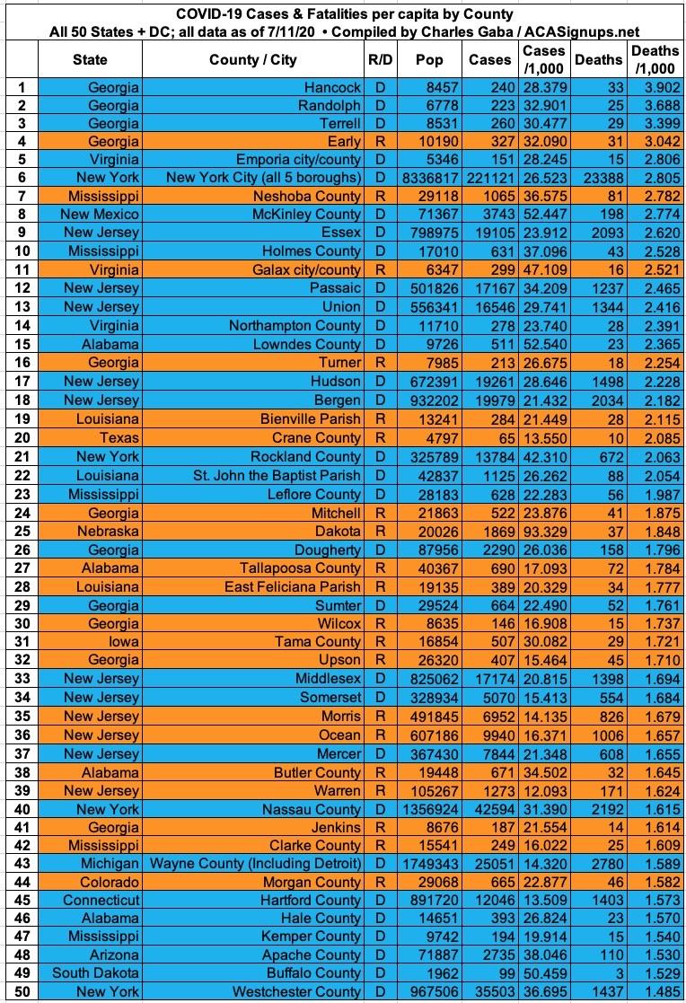 Here's the top 100 counties ranked by per capita COVID-19 fatalities as of Saturday, July 18th (click image for high-res version):