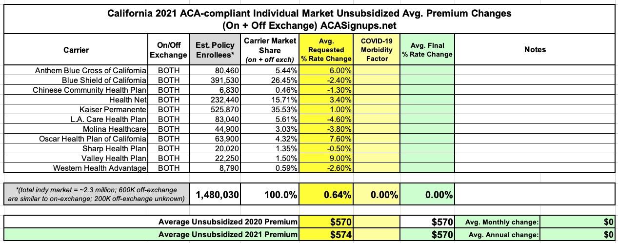 - The preliminary rate change for California’s individual market will be 0.6 percent in 2021, which marks a record low for the second consecutive year and follows California’s reforms to build on and strengthen the Affordable Care Act.