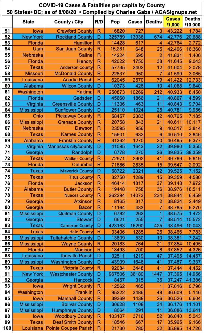 Here's the top 100 counties ranked by per capita COVID-19 fatalities as of Saturday, August 8th (click image for high-res version):