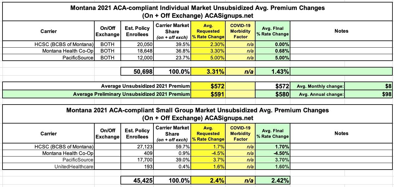 Montana: APPROVED avg. 2021 #ACA rate changes: +1.4% indy market, +2.4% sm. group