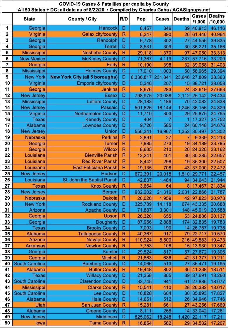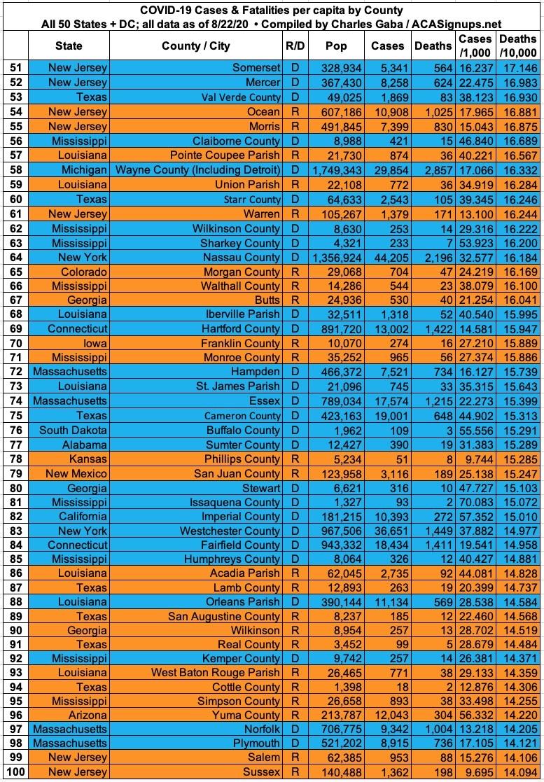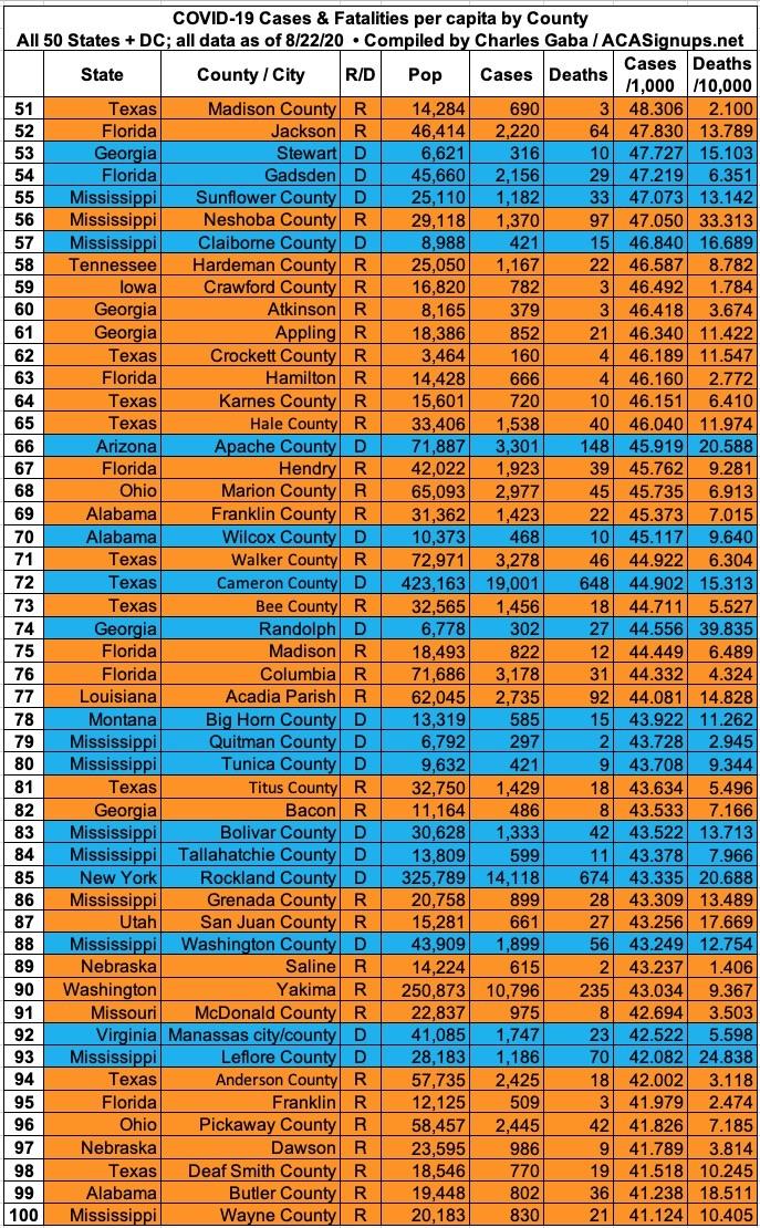 Here's the top 100 counties ranked by per capita COVID-19 fatalities as of Saturday, August 22nd (click image for high-res version):