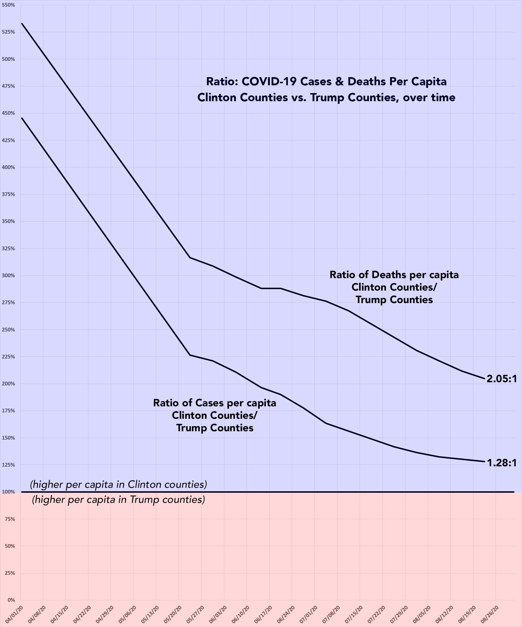 It's also worth noting how the ratio of per capita cases has shifted between the Clinton and Trump counties over time. Back in mid-March, the rate was 4.5x higher in Clinton-voting counties than Trump counties. As of this weekend that ratio was down to 1.3x higher. In terms of the mortality rate, the ratio has dropped from 5.3x to 2.1x.