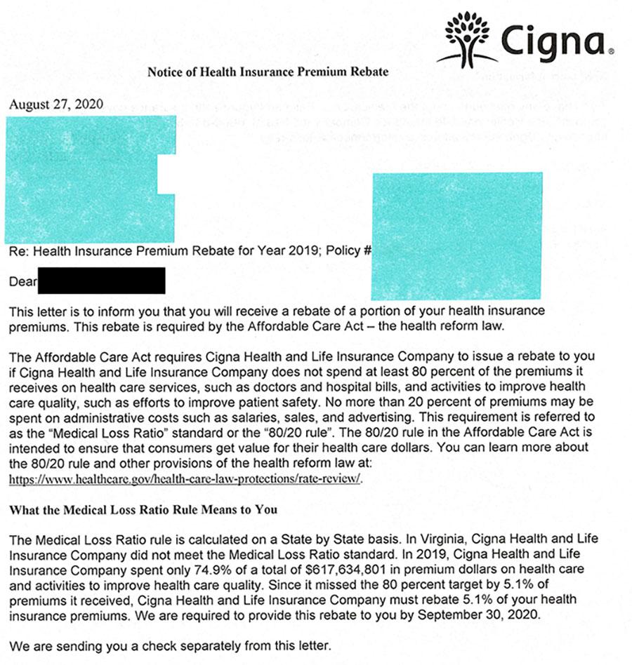 The good news is that I just received my first official evidence that the CY2019 MLR rebate checks are being sent out to the policyholders. A reader in Virginia just sent me this letter they received:
