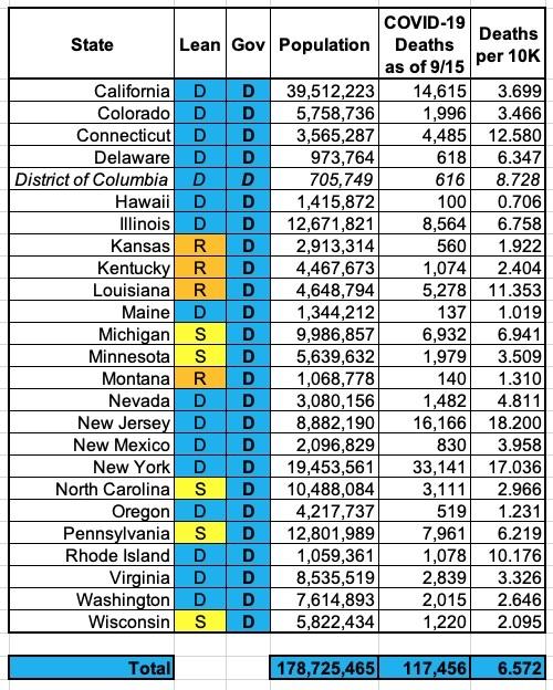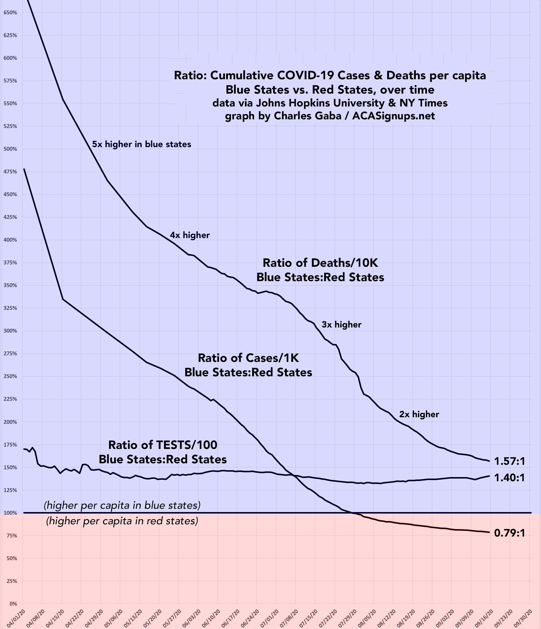 I don't have the historic data to run a graph over time, but here's what the "Blue State/Red State" COVID-19 death rates look like as of mid-September using this definition: