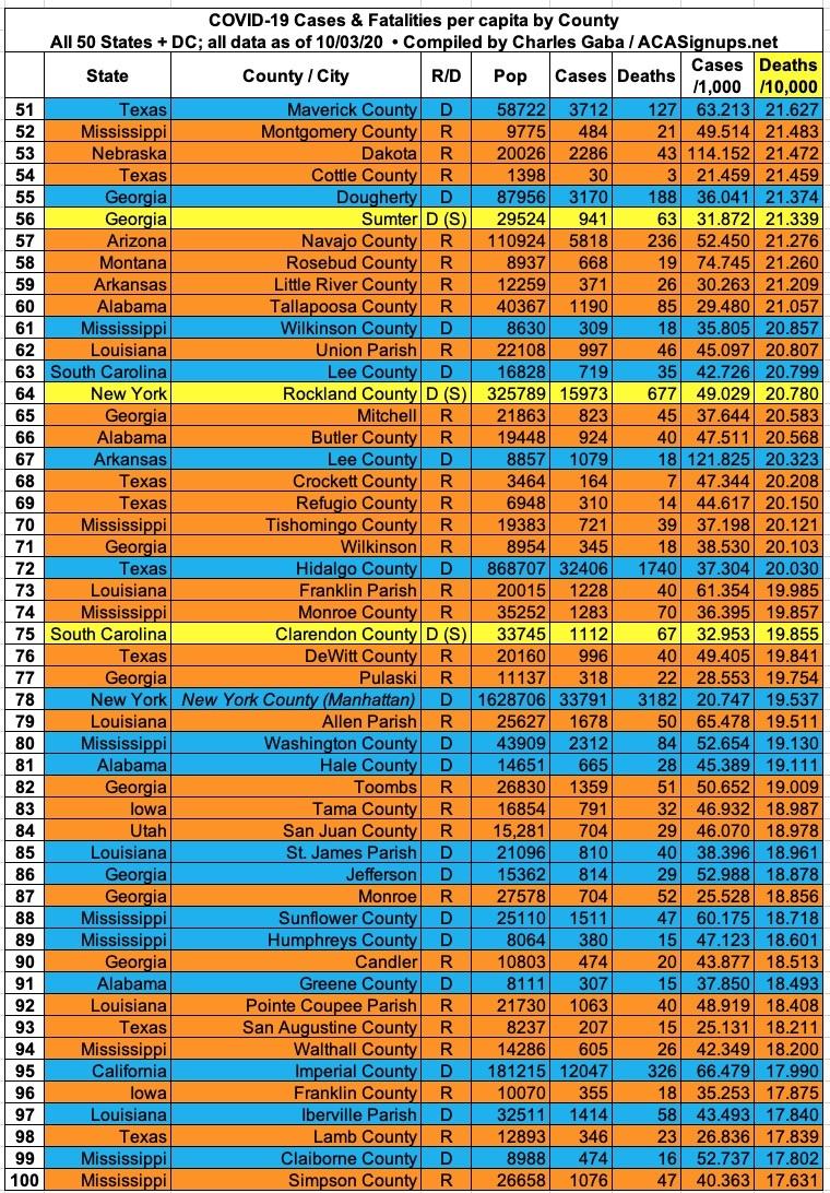 Here's the top 100 counties ranked by per capita COVID-19 fatalities as of Saturday, October 3rd (click image for high-res version):