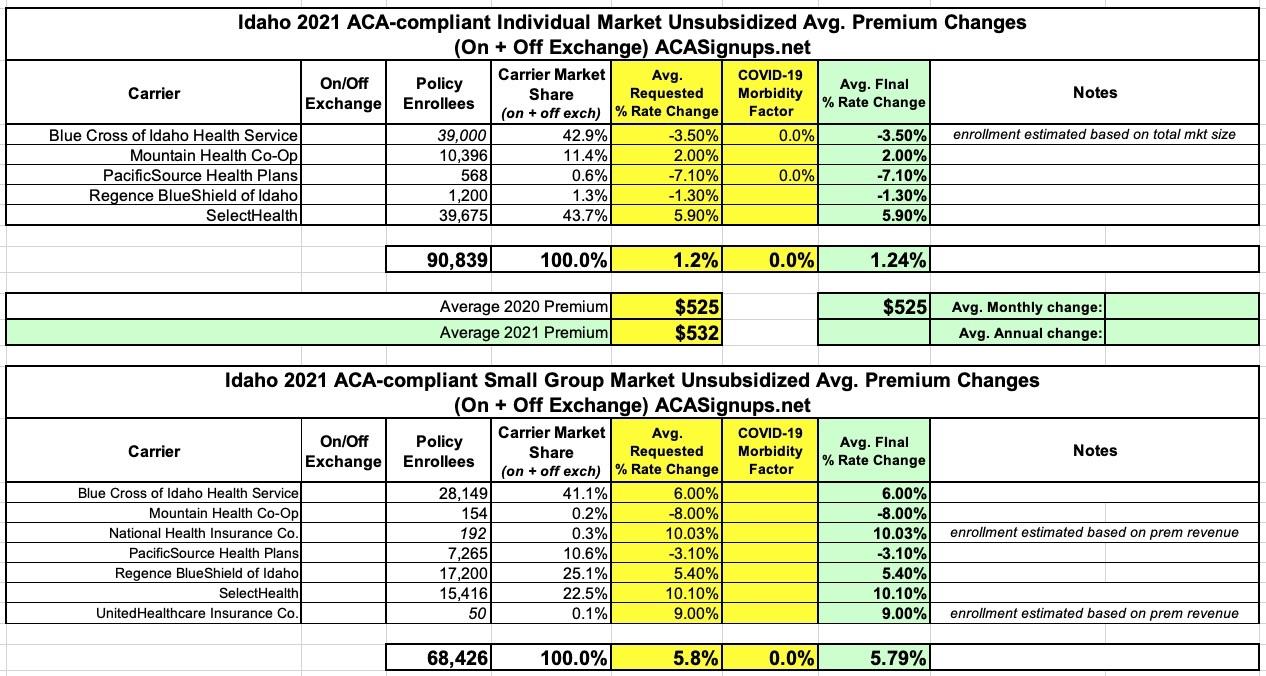 Idaho: Approved avg. 2021 #ACA premiums: +1.2% indy market, +5.8% sm. group