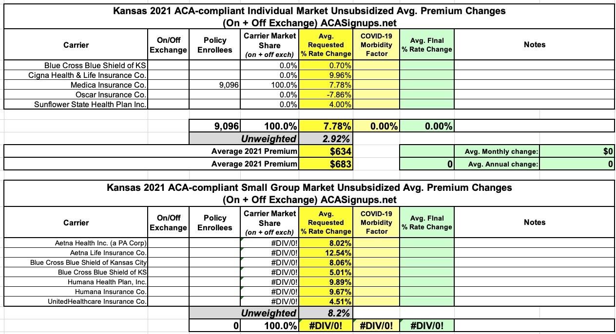 Once again, I'm afraid the actuarial memos for Kansas' 2021 individual and small group market carriers are either absent or redacted, so I have to run unweighted average rate changes, which are likely off significantly (for instance, the individual market is +7.8% unweighted, but if it turns out that, say, Oscar Insurance has 95% of the market share, the weighted average would be more like a 7% decrease).