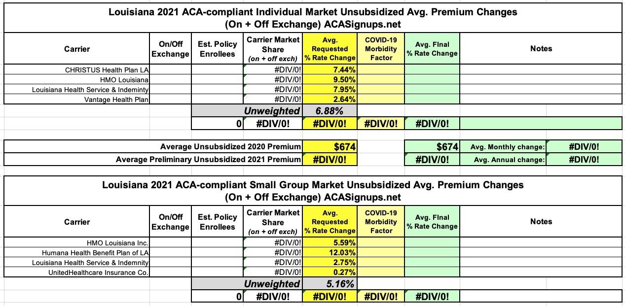 Louisiana: Preliminary avg. 2021 ACA premiums: +6.9% indy, +5.2% sm. group (unweighted)