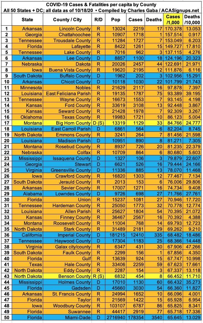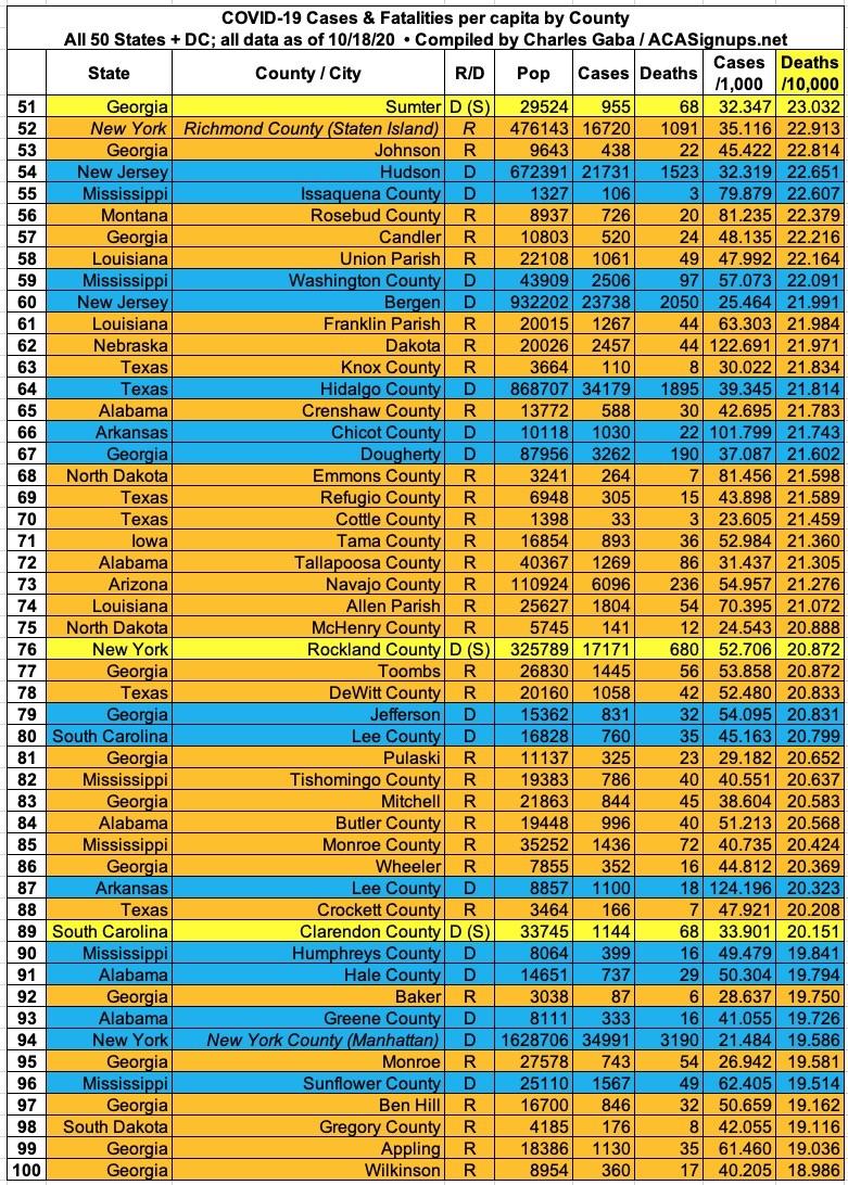 Here's the top 100 counties ranked by per capita COVID-19 fatalities as of Saturday, October 10th (click image for high-res version):