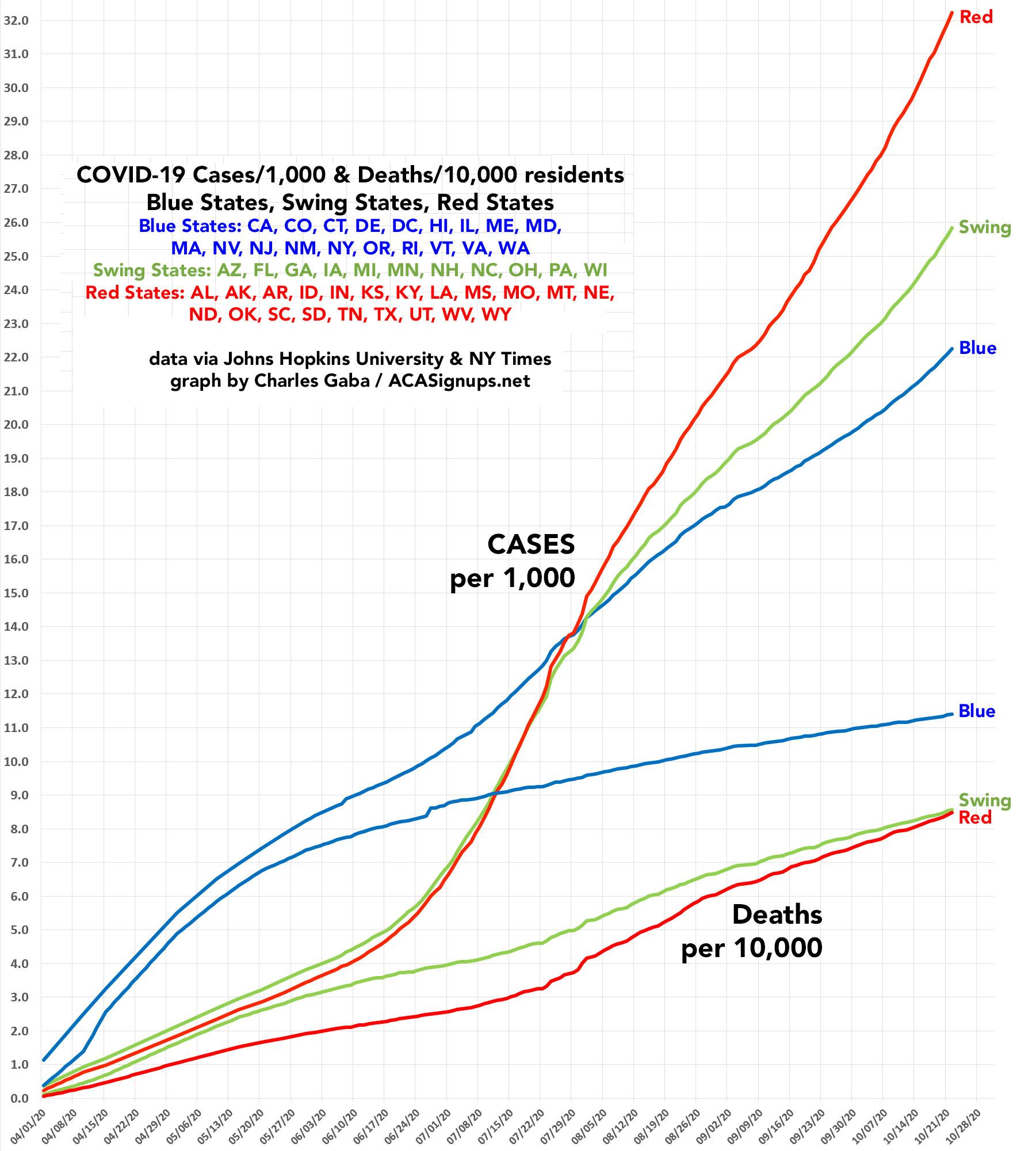 Not only are there now 45% more confirmed cases of COVID-19 per capita in the red states (as defined above...your opinion may vary, of course), but even on the mortality rate front, the red states continue to catch up to the blue states: There are now just 35% more COVID-19 deaths per capita in the blue states than the red states, which are set to bypass the swing states on this measure any day now.