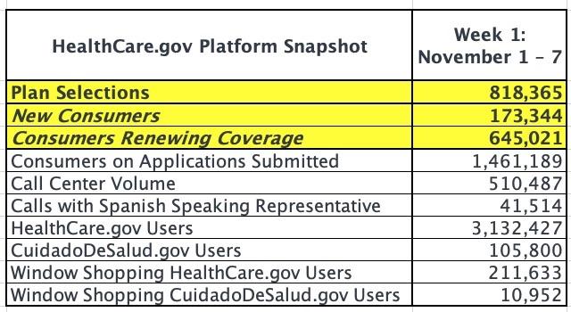 It's also important to note the breakout between current enrollees actively renewing their policies and new consumers enrolling. Last year, in the first 9 days, it was a 74% / 26% split between the two. This year, for the first 7 days it's split 79/21. It's too early to say whether that means much, of course; the ratios could easily shift as we go forward.