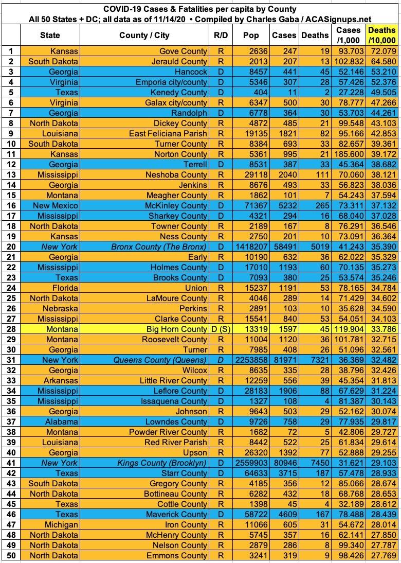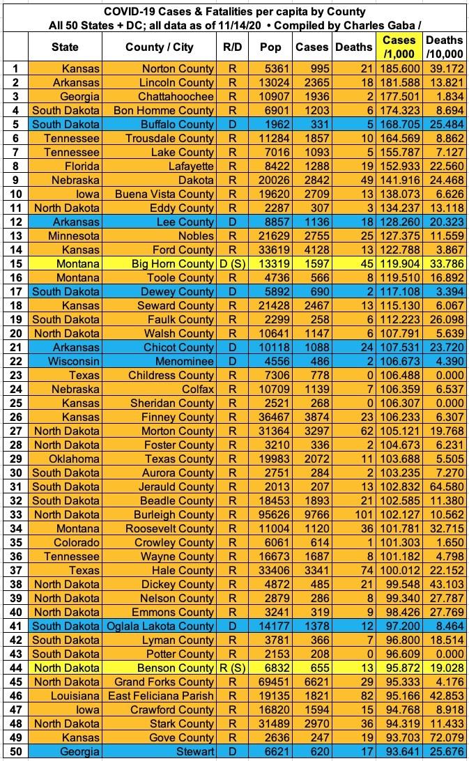 Here's the top 100 counties ranked by per capita COVID-19 fatalities as of Saturday, November 14th (click image for high-res version):
