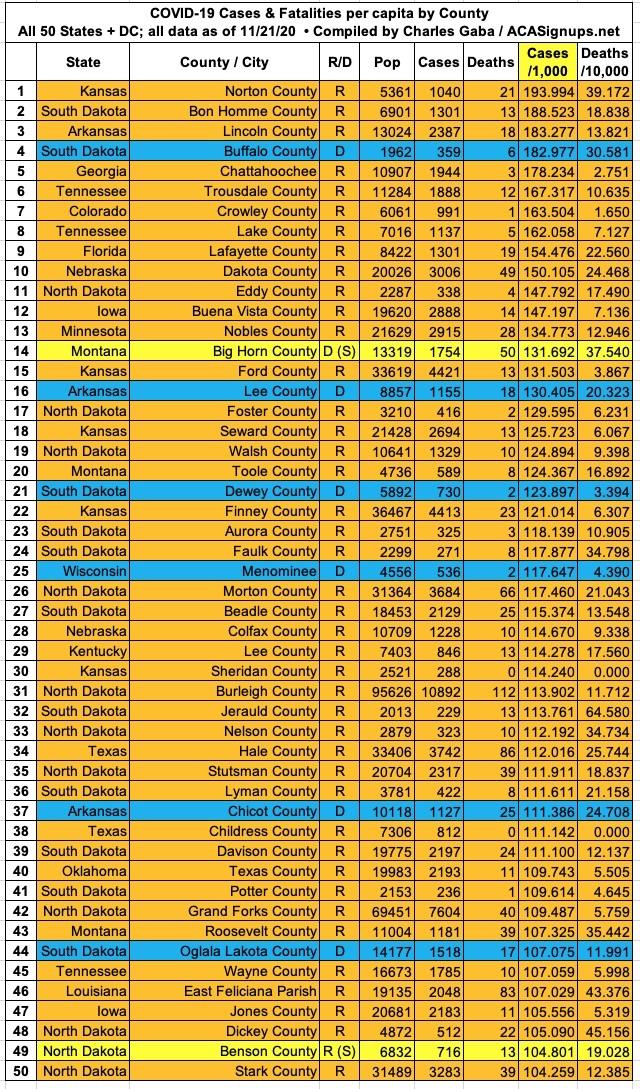 With these updates in mind, here's the top 100 counties ranked by per capita COVID-19 cases as of Saturday, November 21st (click image for high-res version). Blue = Hillary Clinton won by more than 6 points; Orange = Donald Trump won by more than 6 points; Yellow = Swing District