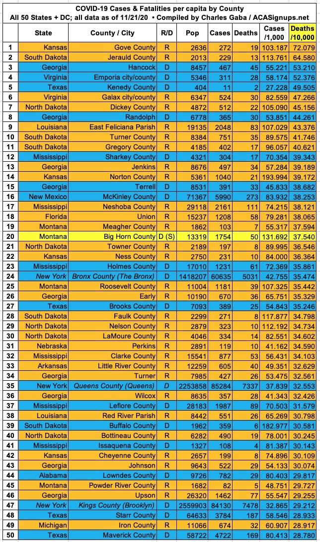 Here's the top 100 counties ranked by per capita COVID-19 fatalities as of Saturday, November 21st (click image for high-res version):