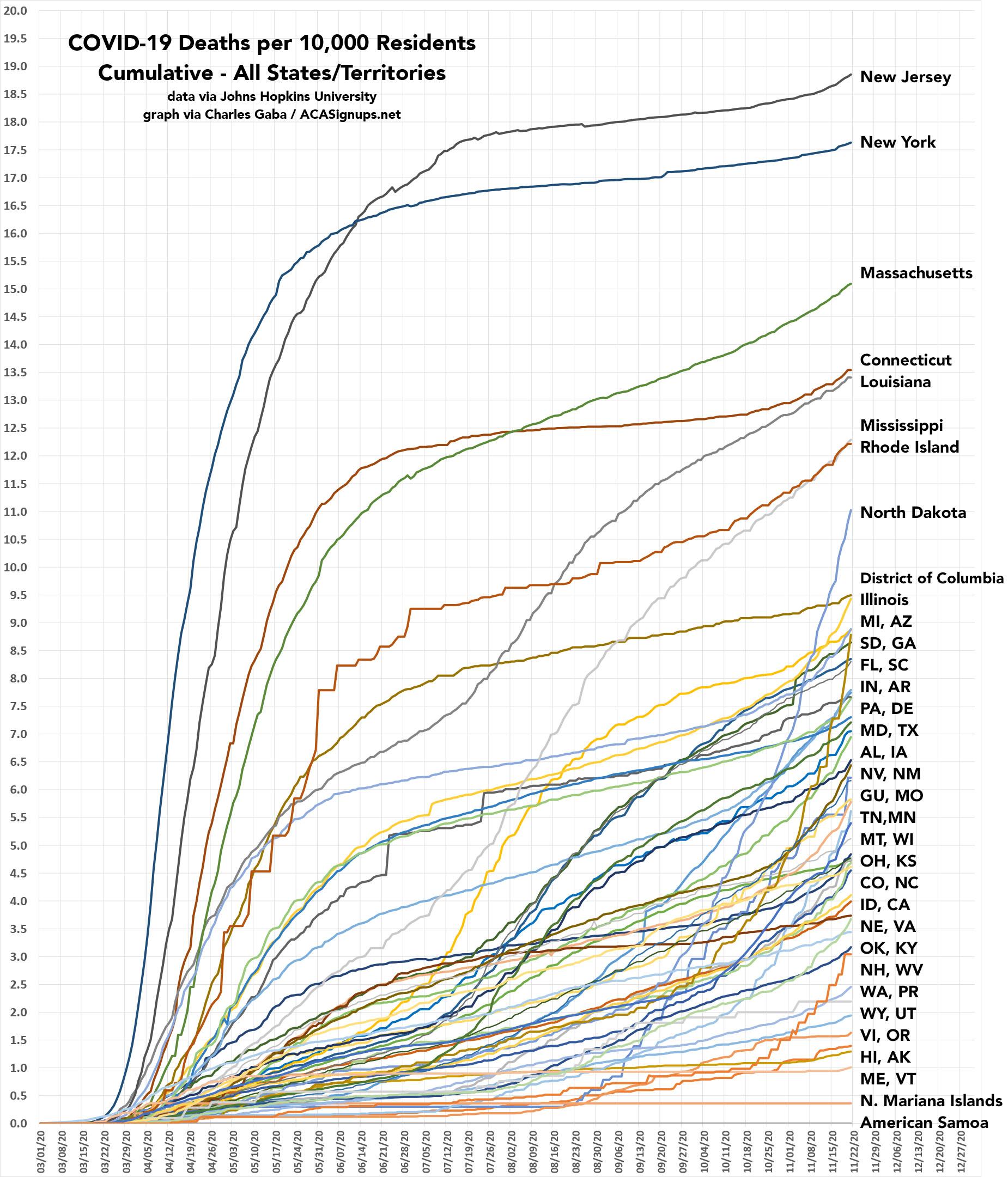 I've done my best to label every state/territory, which obviously isn't easy to do for most of them given how tangled it gets in the middle. The most obvious point is that while New York and New Jersey are still far above every other state, other states are quickly catching up...and the trajectories of both North & South Dakota are incredibly disturbing in particular.