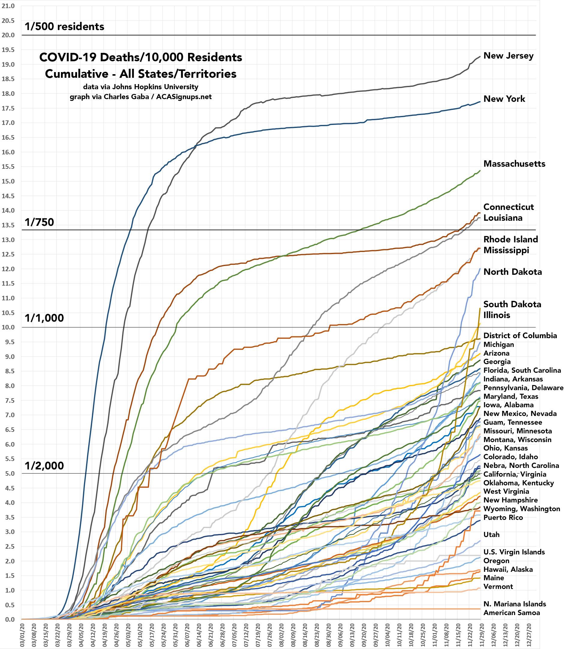 COVID will likely have killed 1 out of every 500 New Jersey residents by the end of the year...but there are four other states where COVID-19 has killed at least 1 out of every 750 residents (New York, Massachusetts, Connecticut and Louisiana), and five others, which have all lost at least 1 out of every 1,000 residents to the pandemic, are about to join that club (Rhode Island, Mississippi, North Dakota, South Dakota and Illinois).