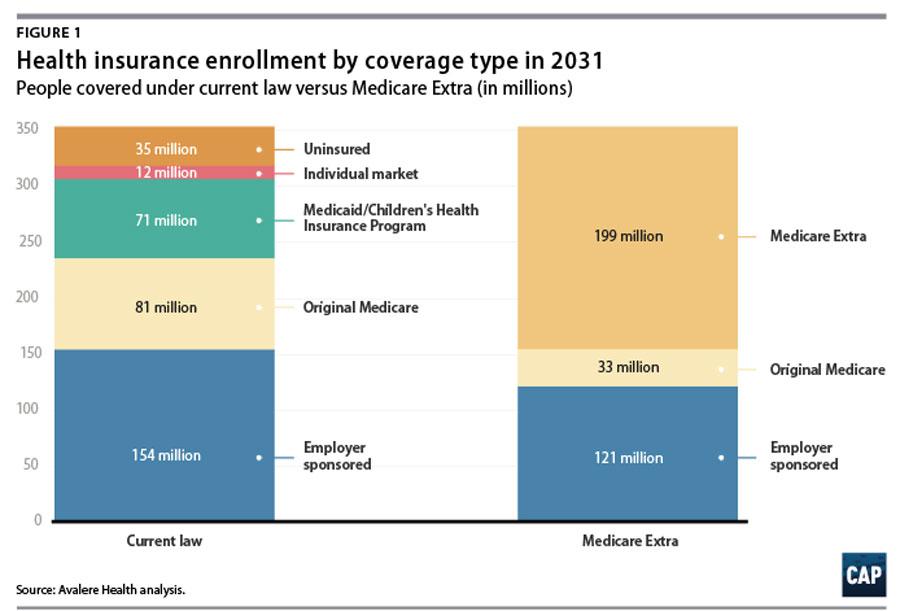 Avalere estimates that Medicare Extra would achieve universal coverage by covering 35 million uninsured individuals. Employer coverage would remain a viable option: 121 million employees would choose to remain in their employer coverage.