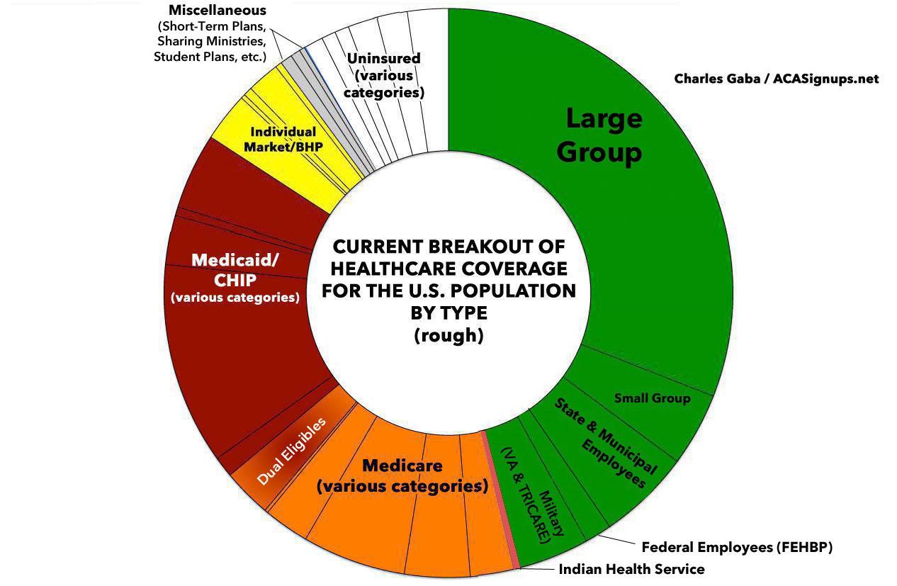 Around half the population is currently covered by private insurance via their employer. The other half is covered via either Medicare, Medicaid or CHIP, are enrolled in private ACA Individual Market policies, are enrolled in a mish-mash of non-ACA compliant plans or have no coverage whatsoever.