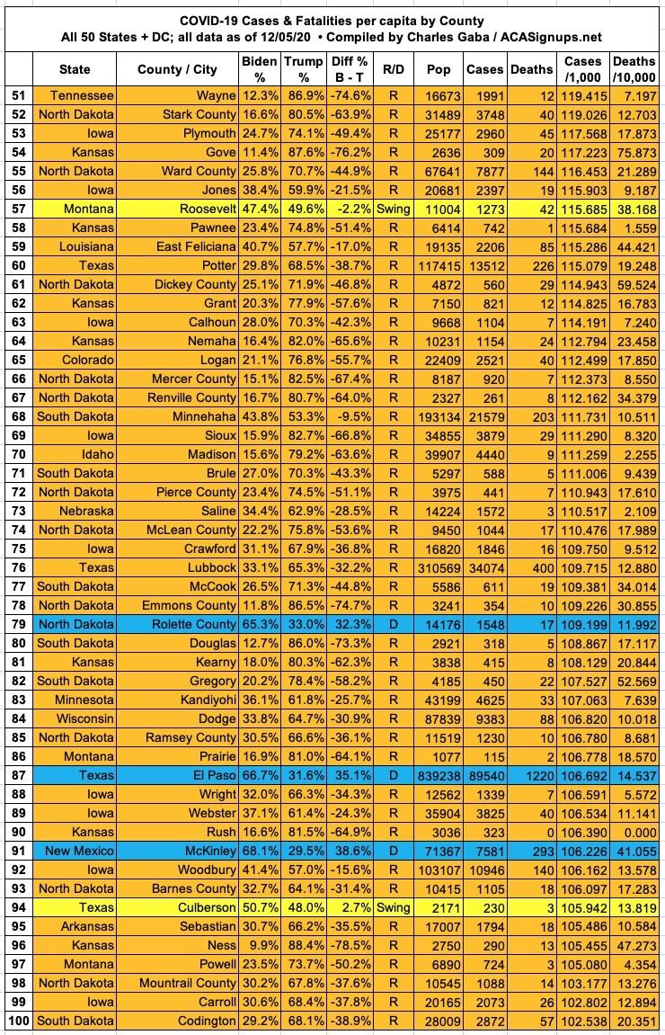 Here's the top 100 counties ranked by per capita COVID-19 fatalities as of Saturday, December 5th (click image for high-res version):