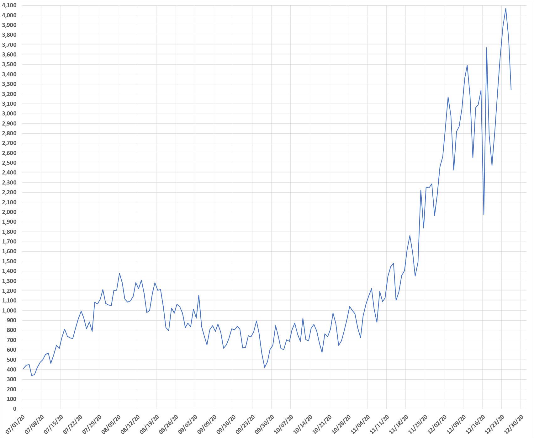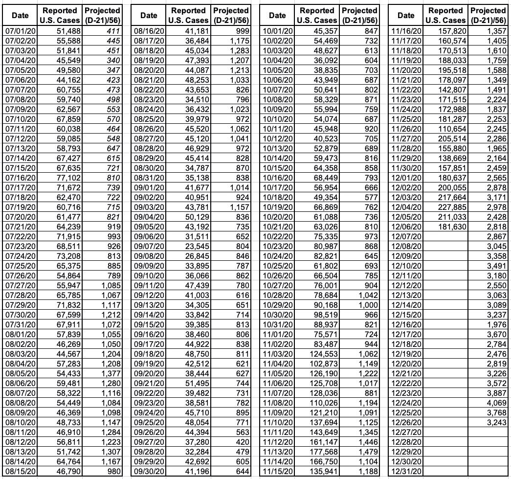 This was a very specific projection (especially the 4,000 deaths on 12/26) so I decided to do the math. Deaths have been lagging positive tests by around three weeks, give or take, so in theory you should just have to go back to see how many people tested positive 21 days earlier to get an idea of how many people will die on a given day...as well as letting you project the death toll up to three weeks ahead, as Dr. Jha did above.