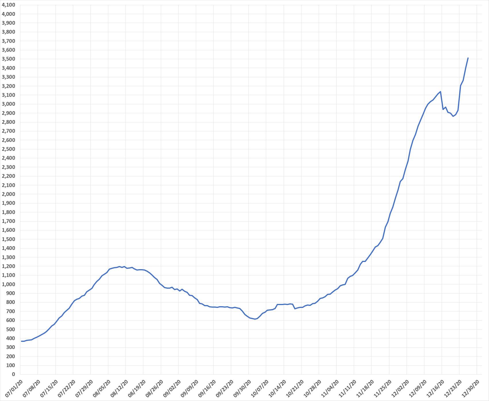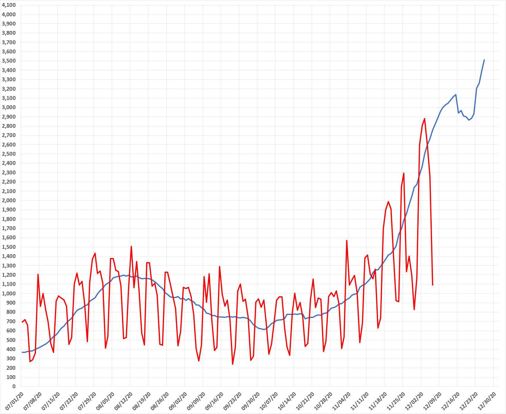 There's still one drop-off which stands out...Thanksgiving weekend, where reporting from many states stopped for up to five days instead of just two. As you can see, the reporting has already recovered from that and is spiking higher than ever...a rolling average of over 3,500 U.S. COVID-19 deaths per day the week of Christmas.